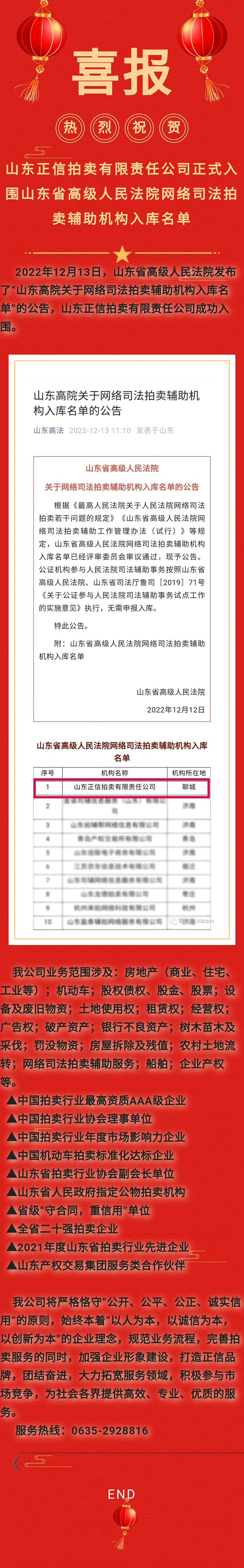 【喜报】热烈祝贺山东正信拍卖有限责任公司正式入围山东省高院网络司法拍卖辅助机构入库名单